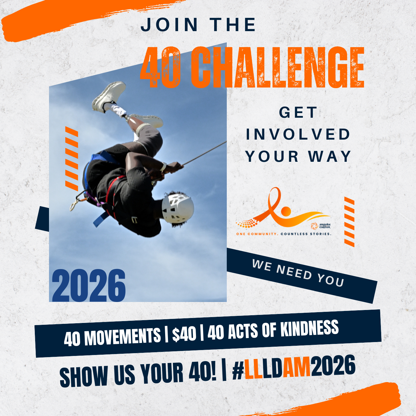 April is Limb Loss and Limb Difference Awareness Month (#LLLDAM2026), and we’re celebrating 40 years of community, advocacy, and progress. Help fuel the next 40 by showing us your 40 — movements, kindness, art, mettle, fundraising, CPV, or something uniquely you. #40YearsStrong #LLLDAM2026 #40Challenge